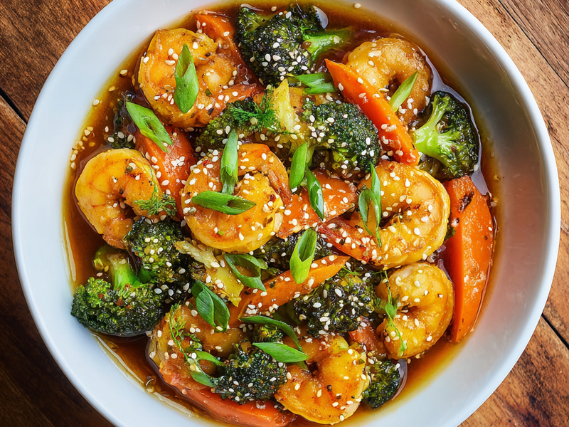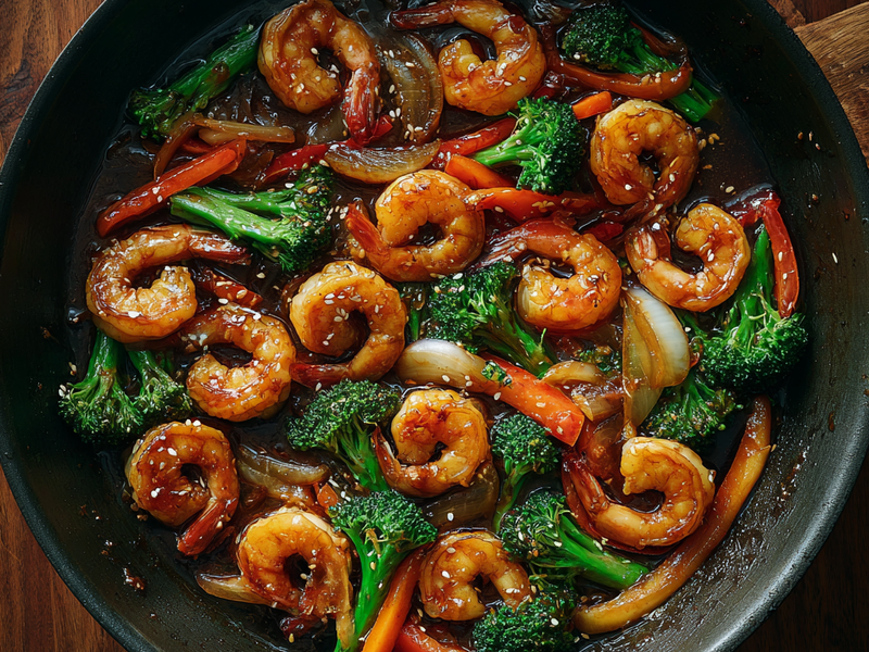 The recipe starts by seasoning the shrimp and cooking them briefly so they stay tender. The vegetables cook next, absorbing some of the flavor from the pan. The sauce is a simple mix of soy sauce, honey, garlic, and ginger. The cornstarch helps the sauce thicken and coat the shrimp and vegetables.