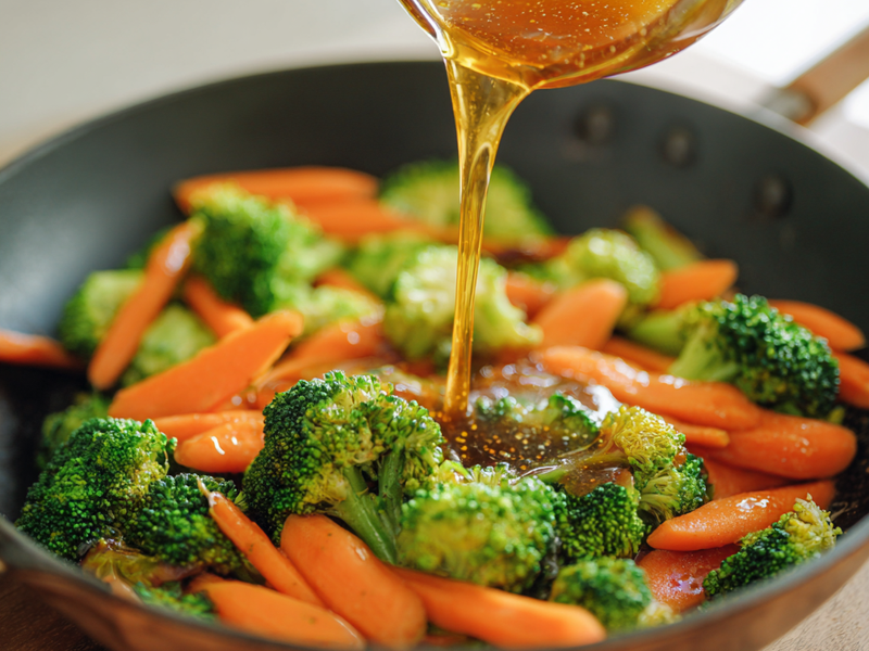 Step 4: Stir together the soy sauce, honey, garlic, ginger, and rice vinegar. Add to the vegetables.