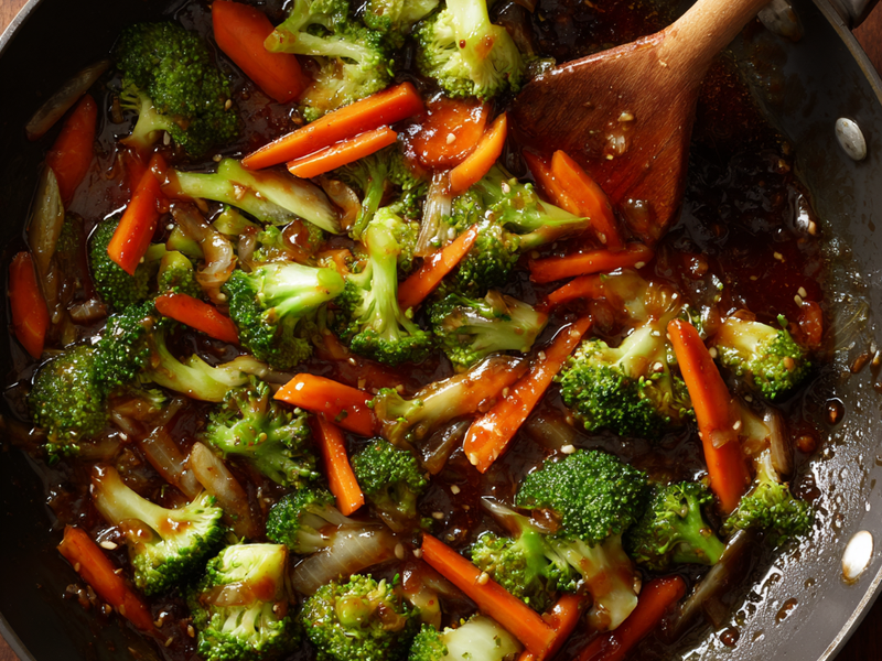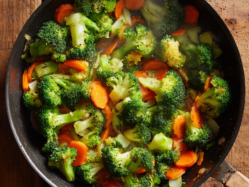 Step 3: Add the broccoli and carrots to the pan. Cook until slightly tender.